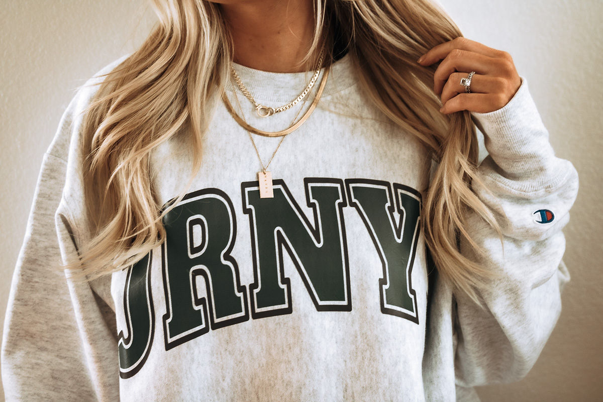 Models wearing Large sweatshirt + Medium sweatpants. Blonde is 5'3" and brunette is 5'9".